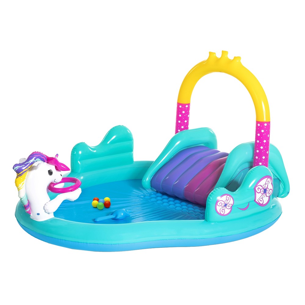 Small pool for kids, with slide and ball-throwing Unicorn game, in an oval-shaped structure, made of sturdy and pre-tested polyvinyl chloride (PVC) material, with a thickness of 0.27 mm, which makes it more durable to sunlight and cold weather and makes it puncture-resistant. The base and side walls can be inflated with air, which prevents children from being injured during play. The pool is used as a way to entertain children, it is practical to use, it does not take up much space and it is suitable for use in outdoor home environments. The pool can be easily cleaned and drained using a drain valve located on the inner base of the pool. The pool has dimensions of 274x198x137 cm and a water capacity of 220 liters. It can be assembled and dismantled easily in only 30 minutes, using an air pump. The set also contains: • An inflatable slide, with dimensions of 137 cm in height, which can be attached and removed as desired. • Beach toys for kids, in different colors, which can be inflated with air using a simple air pump and include a ring, a magic staff and 6 balls. • Self-adhesive repair-patching pieces, made of polyvinyl chloride (PVC) material, which can be used to efficiently repair the small damages of the structure. This product is suitable for use by children over 2 years old.