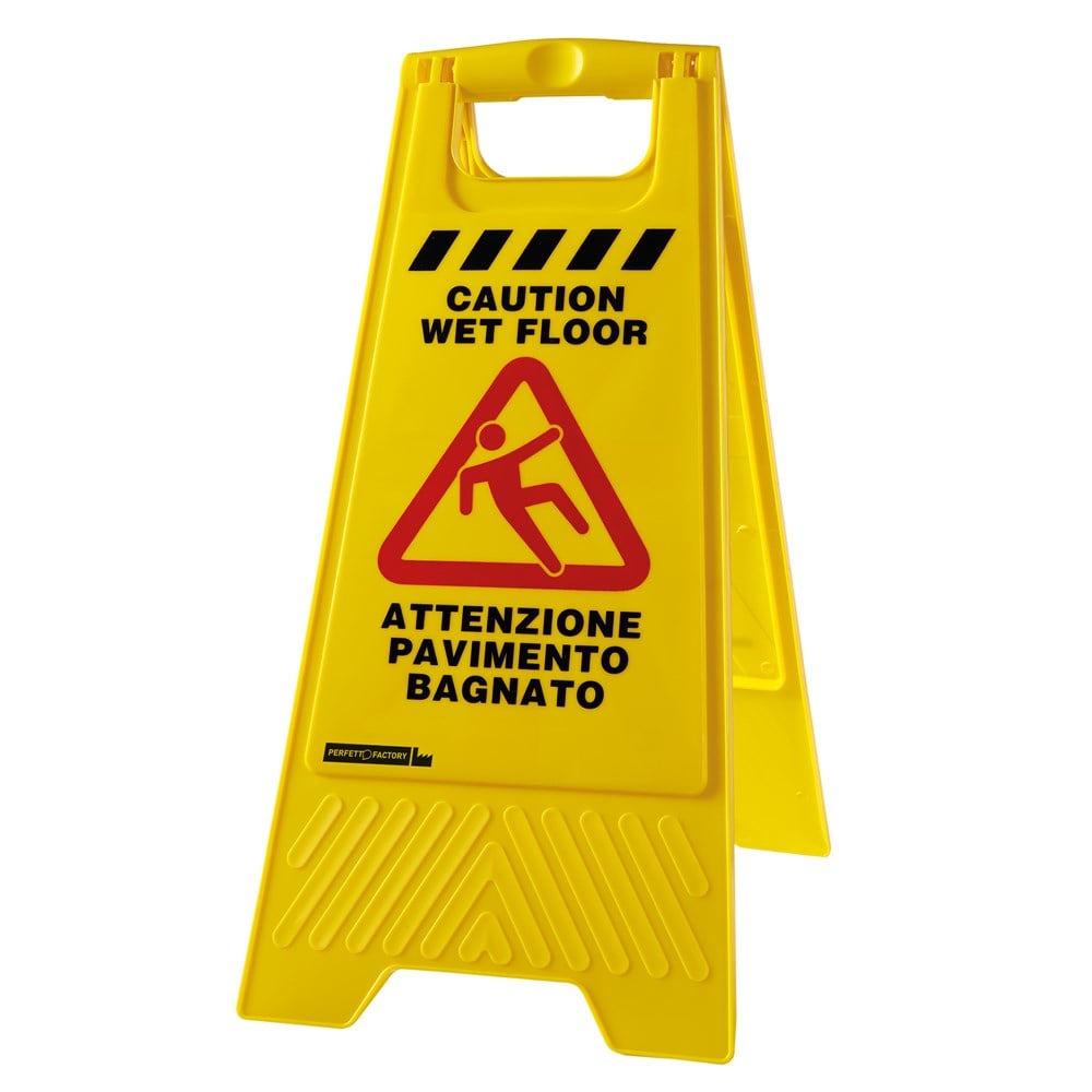 Central signaling triangle with "slippery" inscription. Made of polypropylene resistant material, with inscription in 2 languages English and Italian. Used in places where there is a flow of traffic. The table informs people to be careful when moving to the area as there is a risk of slipping from the washed floor. It can also serve as a signal when there is damage or dirt in the area. It is used both in indoor and outdoor environments and is not damaged by weather conditions. Yellow color.