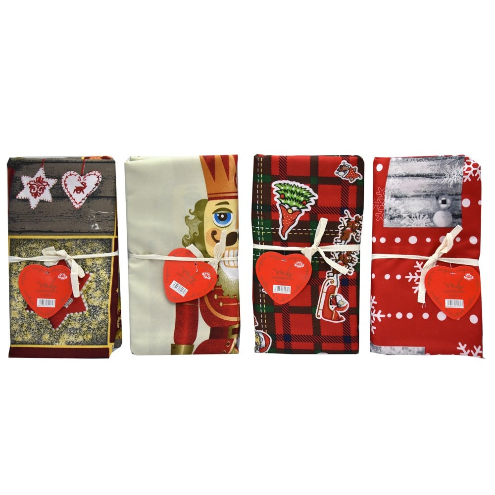 Rectangular tablecloth, made of polyester material. The component material is resistant to washing, does not absorb fat and does not hold wrinkles, which makes it easier to wash and iron. It is mainly used in domestic environments, for holidays such as Christmas and New Year.