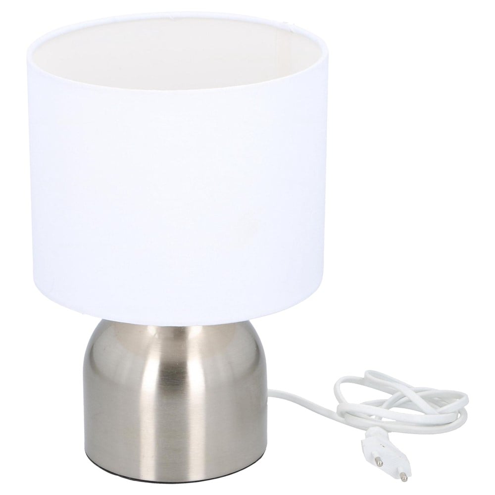 This table lamp from Grundig has a modern look. You operate the lamp with touch control, simply by touching the metal base. One touch and it turns on. Are you tapping twice? Then you dim the lamp. When tapping 3 times, the lamp becomes brighter and after 4 times it goes out again. The lamp has a matt-gloss metal base and a white, fabric round shade (diameter 18 cm). The type of lamp is called a table lamp, but it just as well deserves a place on a cupboard or shelf. For example, you can use it as a night light, as a reading lamp or as mood lighting in your living room.