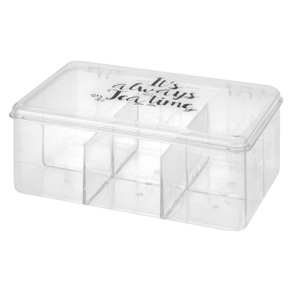 The tea container is made from a lightweight, yet durable material. It has a tight closure that ensures comfort of use and extends the freshness of the stored teas. Thanks to the compartments, it is easy to organize tea bags with different flavors. Useful in every home. It can be taken with you on a trip, camping, or picnic to always have your favorite teas at hand.The container measures 21.5 x 15 x 8.5 cm and has 6 compartments for tea inside. The container is made from the highest quality material in a transparent color. The transparent color allows you to comfortably check the contents without having to open it. It is equipped with a lid that ensures a tight seal and protects the contents from moisture, light, and other external factors that could affect the quality of the tea. The container has 6 compartments, which allow for storing different types of tea separately, preventing the mixing of flavors. It helps to maintain order in the kitchen.