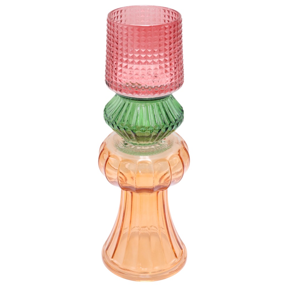 This glass candle holder, with an elegant height of 27 cm and a base of 9 cm, is a decorative piece that brings warmth, color and finesse to any environment. Made of multi-colored glass, it creates a beautiful play of light and reflections when the candle is lit, turning the space into a peaceful and enchanting scene. Its long shape and elegant silhouette make it perfect as a central decoration on a table, on a dresser or as an accessory in festive environments. The rich and balanced colors add vibrancy, without losing the feeling of tranquility that the candlelight conveys when diffused through the glass. This holder is more than a functional holder, it is an artistic object that enriches the space, brings atmosphere and adds a personal and warm touch to every corner of your home.