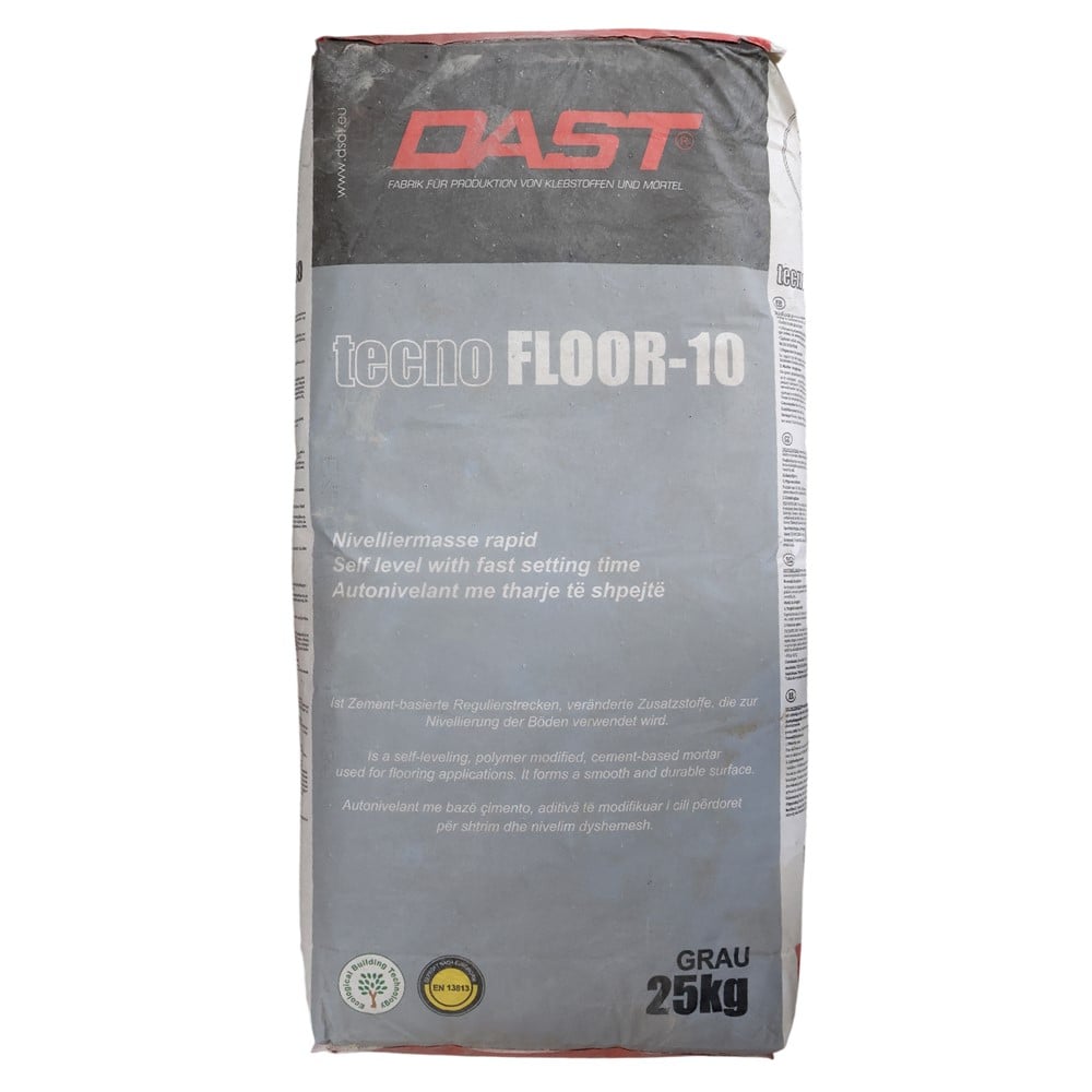 Cement based powder form product and sand with selected granulometry, synthetic resins and additives which fasten significantly the solidifying process. Self-levelling effect offering good workability and laying and flat smooth surface. It is shaped in a uniform way in a few hours without causing shrinkage. Resistant to compression and erosion .For interior environments. The cement floors levelling up to 10 mm thickness. The levelling before placing the ceramic tiles, natural stone, wood parquet, pvc, carpet etc. Important Notes: Do not use it in gypsum or anhydride supports. Do not use it on prefabricated concrete elements .Do not use it on metallic surfaces .Do not use on structures subject to strong movements. Mix 25 kg Tecnofloor powder with 6-6. 5 litre water by using an electric mixer with 500 rotations per minute until a homogenous mass is obtained. Then leave the mixture for 5 minutes to rest and mix again before use. The obtained mass is ready for use in about 45-60 minutes. The supports must be flat and stable, mechanically and dimensionally resistant according to the purpose of use; it must be clean of small pieces, oils, varnishes, wax and anti adhesive materials. The cleaning of oils, varnishes, wax and anti adhesive materials must be done manually or mechanically.
