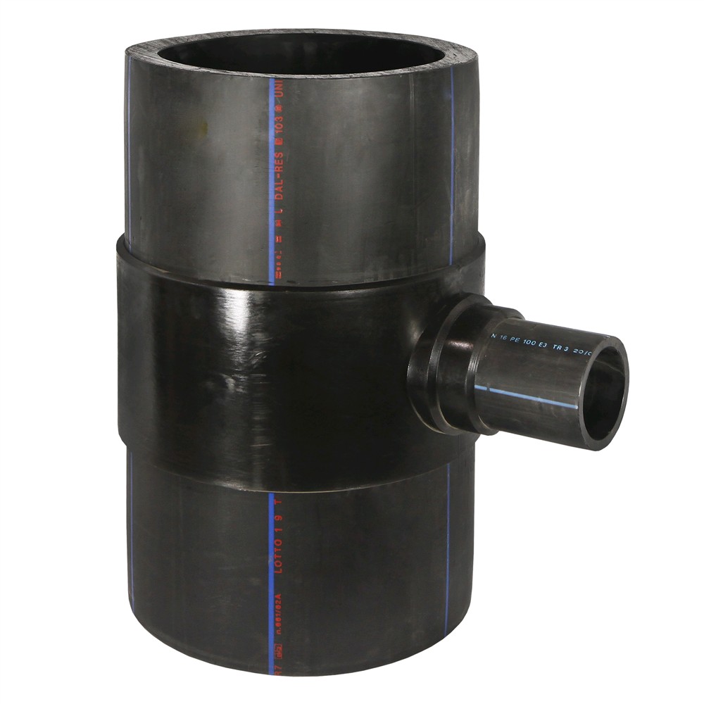Tee reduced HDPE Ø 335x110x335mm with angle 90° used widely today in Europe for angular lines installations of water supply infrastructure and lines for the transport of natural gas. The tee reduced mounted by the method Butt-fusion. Tee enables reduced network branching of HDPE pipe Ø 110 from main pipe HDPE Ø 335. For welding HDPE pipe with tee used welding heat machinery which makes it possible merger of tee pages and pipe and through pressure enables their union. Manufactured with European standards, resistant to corrosive materials, high resistance to deformation of land and resistant to pressure up to 10 Bar.