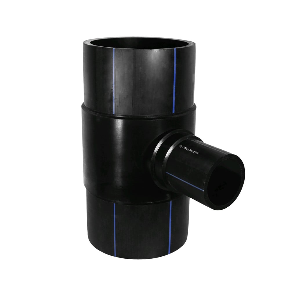 Tee reduced HDPE Ø 315x140x315mm with angle 90° used widely today in Europe for angular lines installations of water supply infrastructure and lines for the transport of natural gas. The tee reduced mounted by the method Butt-fusion. Tee enables reduced network branching of HDPE pipe Ø 140 from main pipe HDPE Ø 315. For welding HDPE pipe with tee used welding heat machinery which makes it possible merger of tee pages and pipe and through pressure enables their union. Manufactured with European standards, resistant to corrosive materials, high resistance to deformation of land and resistant to pressure up to 10 Bar.