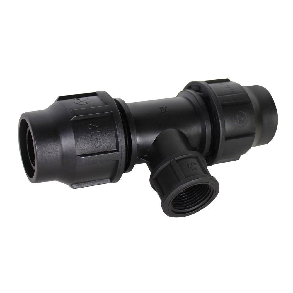 Tee with faucet of PE 32x3/4"x32 mm female with angle 90°. Used to installations angular water supply infrastructure lines, in irrigation and agricul, etc. This tee enables network branching 90° angle. This tee connect LDPE pipe Ø 32 with other fittings by fillet, for joining the fillet recommend tu use teflon whiles pipe connect whith tee in mechanically with faucet. Manufactured with European standards, resistant to corrosive materials designed to withstand pressure up to 6 Bar.