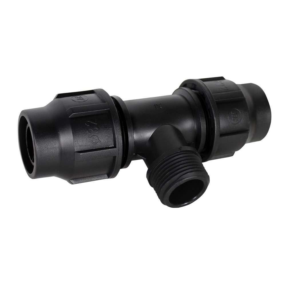 Tee with faucet of PE 32x1"x32 mm male with angle 90°. Used to installations angular water supply infrastructure lines, in irrigation and agricul, etc. This tee enables network branching 90° angle. This tee connect LDPE pipe Ø 32 with other fittings by fillet, for joining the fillet recommend tu use teflon whiles pipe connect whith tee in mechanically with faucet. Manufactured with European standards, resistant to corrosive materials designed to withstand pressure up to 6 Bar.