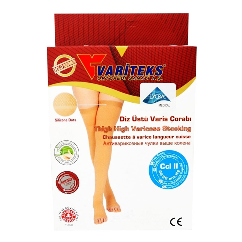 Thigh-high varicose stocking, with open toe, made of satin and microfiber material, and equipped with microcapsules with Aloe Vera extract, which have therapeutic properties, have a neutral pH level and help regenerate skin cells. The constituent material is soft, it makes socks easy to wear and it allows the foot to air out. The socks have a high level of compression and are suitable for use: