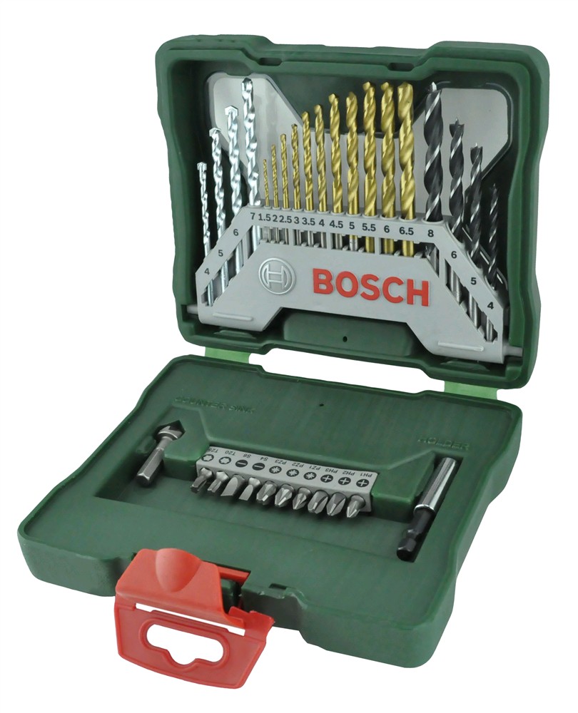30 Piece X-Line Titanium Accessory Set Comes with : 11 HSS-Tin metal bits (Diameter1.5-6.5 mm), 4 TC masonry drill bits (Diameter 4/5/6/7 mm), 4 wood drill bits (Diameter 4/5/6/8 mm), 10 screwdriver bits L = 25 mm, PH 1/2/3, PZ 1/2/3, SL 4/6 T 20/25, Magnetic universal holder.