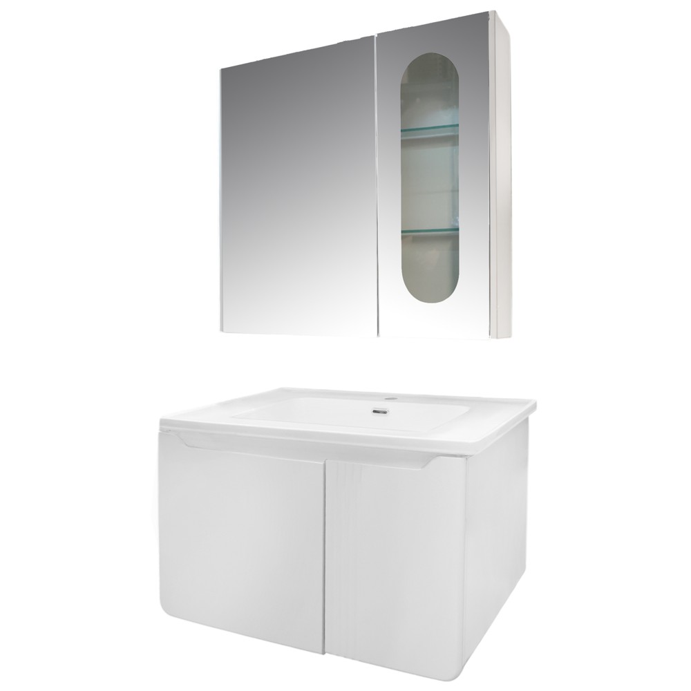 The "Blanca Peak" set consists of a vanity unit, a porcelain basin, and a mirror. The furniture is mounted on the wall to give a modern look to your bathroom as well as to facilitate cleaning underneath it. Conceived in PVC with water resistent properties, this furniture is ideal for environments with high humidity such as the toilet. Its white color and integrated LED lighting brings freshness to your bathroom, as well as practicality with the drawer for storing your items. The white porcelain basin is very easy to clean. The mirror with shelves makes maximum use of the toilet space. Furniture dimensions : height 48.5 cm x width 80 cm x depth 50 cm. Dimensions of the sink : width 80 cm x depth 50 cm. Mirror dimensions : height 70 cm x width 75 cm x depth 15 cm.