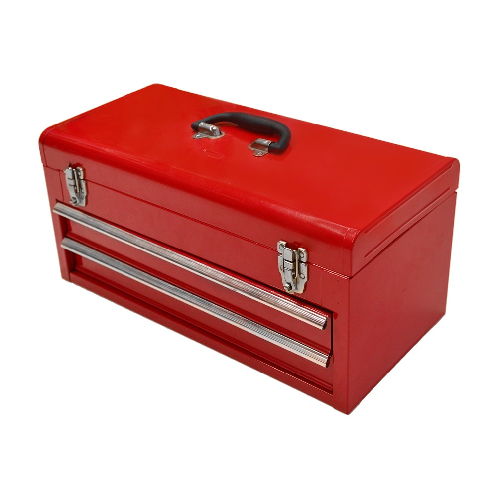 This portable steel tool box has two drawers, two trays, center lock with two keys, lid activated rear locking bar, comfort grip handle,and two latches. The unit is made from durable cold rolled steel.This tool box also has a industrial powder coat paint finish for corrosion and scratch resistance.