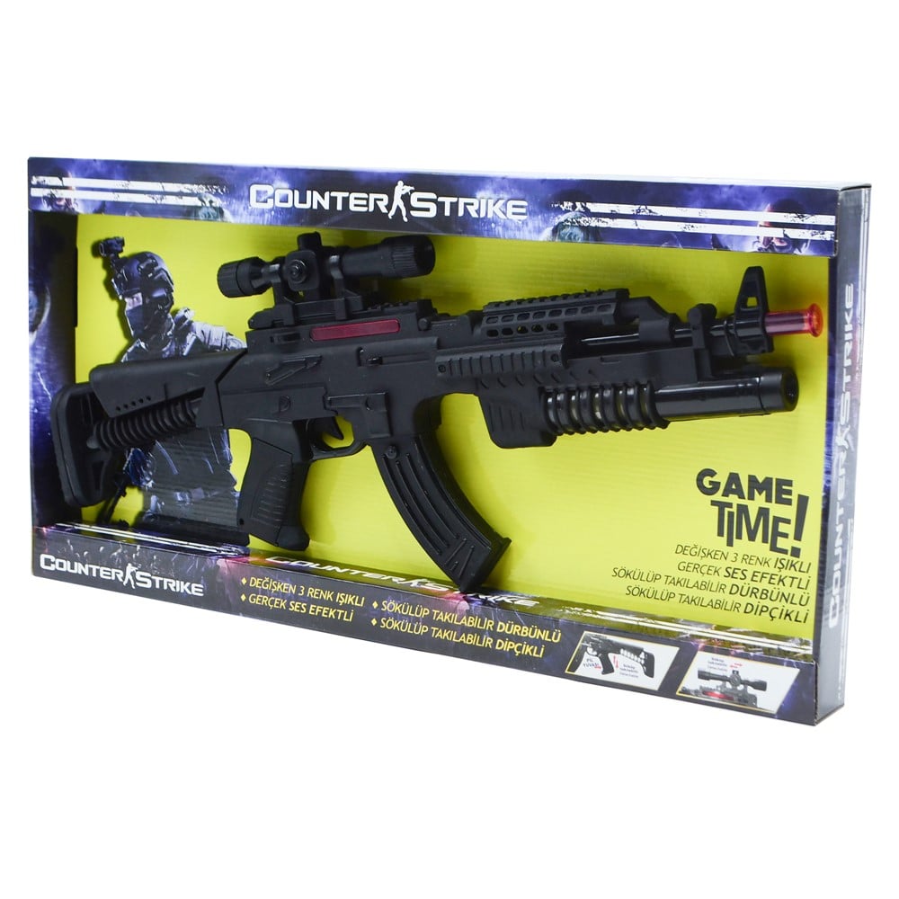 Toy gun for kids, made of plastic material, in assorted colors, with a length of 56 cm, equipped with lights and music. It can be used by kids to play and it helps in the development of motor skills, coordination skills and the development of interpersonal skills, through role play, causing children to spend more time outdoors. The constituent material and the paint have no toxic or harmful composition for children and the product is certified for children's safety. This product is suitable for use by children over 3 years old.