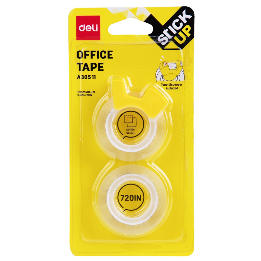 Transparent adhesive tape with noterband, Deli 13.8m x12mm, 2 Pieces. It is used for gluing letters, between them, the set also has a small notary for easy cutting of the glue. Used in offices, schools, etc.