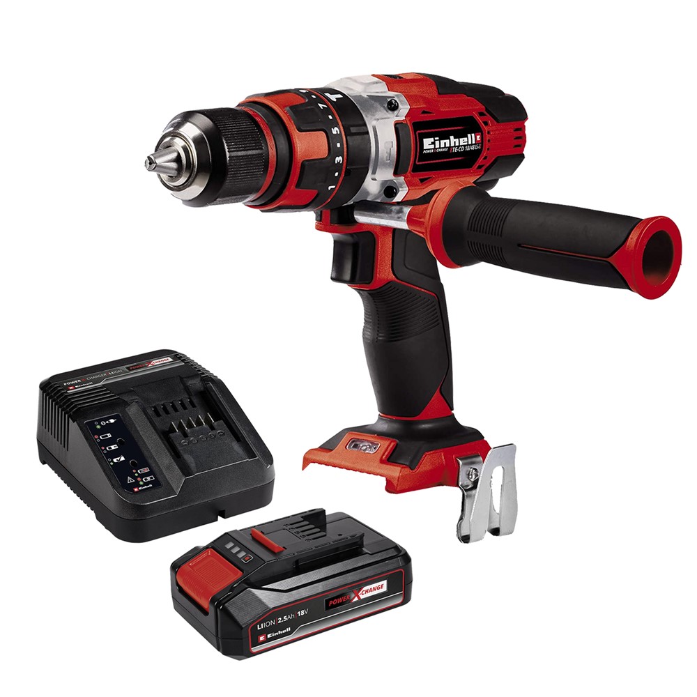 Trapan me bateri, Einhell, TΕ-CD 18/48 Li-i - Solo , 18 V, 0-1500 rpm + Bateri dhe karikues, 18 v, 2.5 Ah, Einhell, Power X-Change Starter Kit, sinjalizues LED, regullues elektronik I karikimit