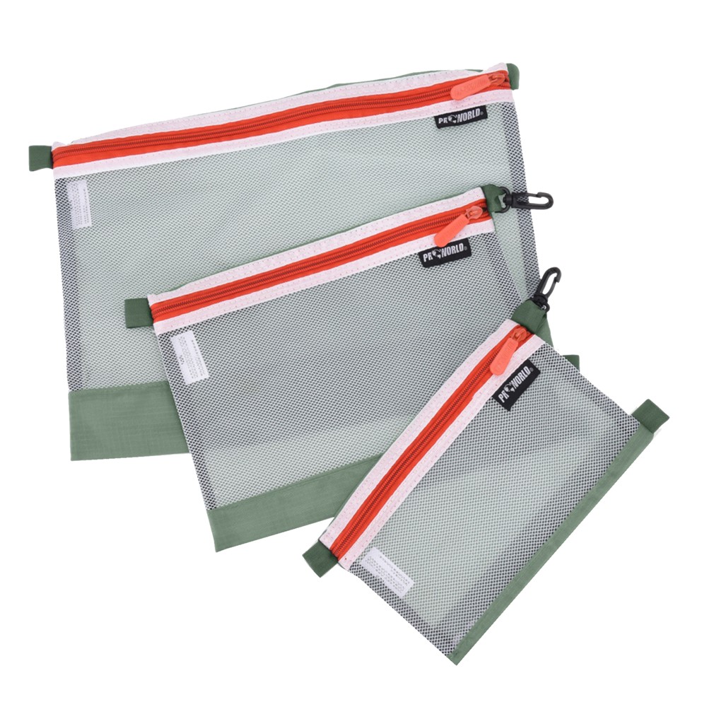 Set of travel organizer with 3 pieces in dimensions: 37x26, 27x21, 22x15 cm, made of transparent polyester material, with zipper. Used to keep personal accessories safe when traveling. Ideal for use on air travel thanks to color transparency. The product are in different colors which can,t be selected.