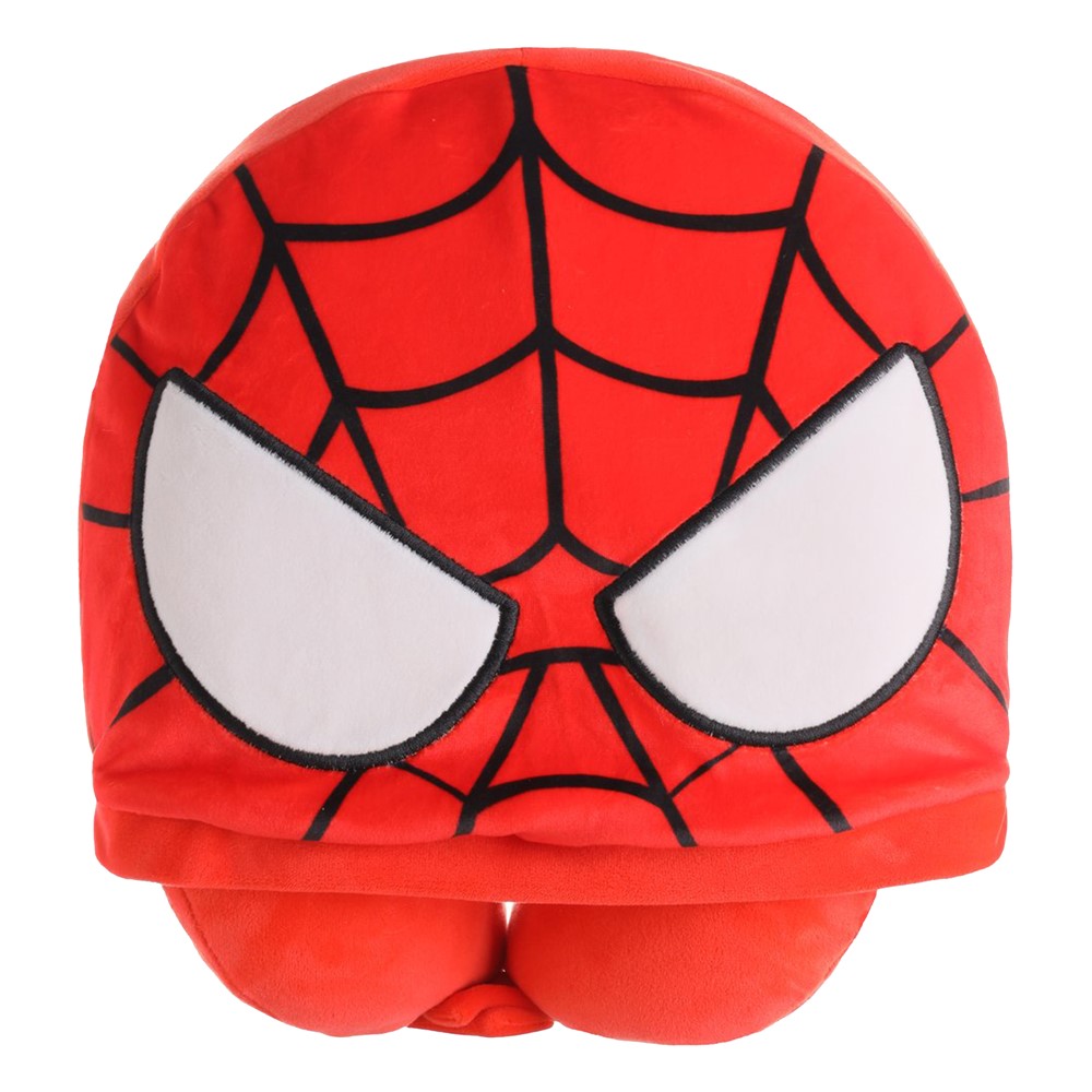 U-shaped travel cushion with hat, made of cotton, polyester and elastane material, in red color with Spiderman design, and with soft polyurethane padding material, with antibacterial and hypoallergenic properties. It is used to support the head or to sleep during a car or plane trip, without damaging the neck vertebrae. It has compact dimensions, which make it practical to take with you on trips. The constituent material is soft on the skin and does not cause irritation.