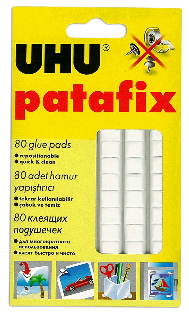 UHU patafix is a repositionable, reusable adhesive for quick and clean bonding, to attach small objects to virtually any surface such as walls, furniture, windows, etc.