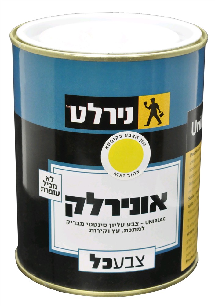 Oil paint Unirlaque 750 ml yellow color. A high quality enamel paint that can be applied on every wooden and metal surface, intended for both, interior and exterior use. Glossy topcoat based on selected synthetic resins. Bears Israel Standards Mark 765. Intended for painting metal, wood and walls after suitable preparation and application of primer. Special Features: High gloss, maximal flexibility,high durability under exterior conditions, doesn’t contain lead, spreads very well when applied by brush, intended for decorative painting on top of a suitable primer. Thinner: Dilution quantity (by volume) up to Brush 5%, rolle 5%, sprayer 20%. Shades In RAL shades or according to the Nirlat Millennium color fan. Gloss High, Theoretical coverage (m2/l) Approximately 12, depending on shade. Dry to touch 2-3 hours Dry to recoat 24 hours.