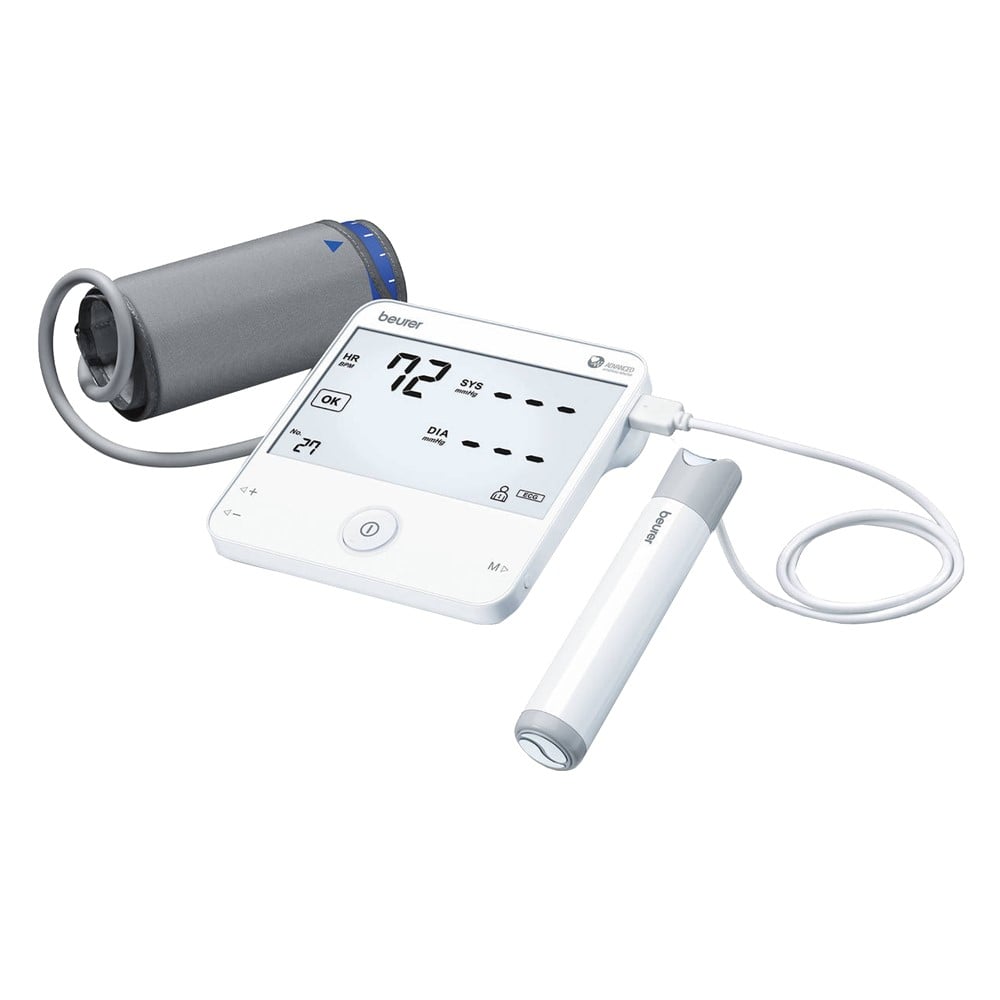 Blood pressure monitor, which is also equipped with an ECG device, which allows the recording of an electrocardiogram to monitor heart rate. The tension apparatus is equipped with a universal cuff for the arm circumference from 22 to 42 cm. Thanks to Bluetooth® technology, transmitting measured values ​​in the "Beurer CardioExpert" application is very simple. Characteristics: • Optimal control of blood pressure and heart rate through the application and software • Bluetooth® for transmitting measured values ​​to the smartphone • Prolonged arrhythmia detection (eg atrial fibrillation and extrasystoles) • Automatic measurement of blood pressure and heart rate • 1-channel ECG device for recording heartbeats • Wireless transmission of measurement results • PC / USB cable interface included • Detailed calculation of average values ​​measured with "Beurer CardioExpert" • 2 x 60 memory • Risk indicator • Arrhythmia detection • Manicures suitable for arm circumference from 22 to 42 cm • Indicates the date and time • Turns off automatically • Warning in case of usage errors • Battery replacement indicator • Free download of "Beurer CardioExpert" software and application.
