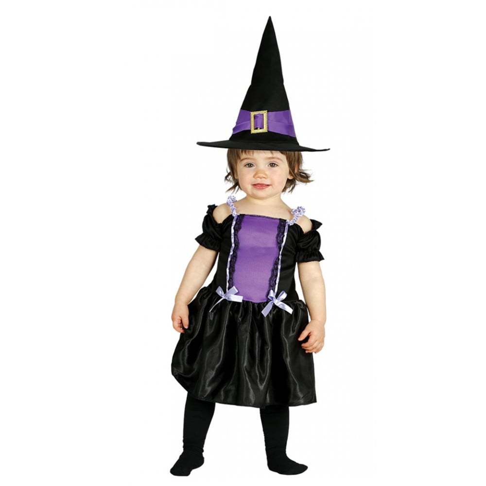 Witch costume for children, made of polyester material, in purple colors. The component material is soft to the touch and does not cause skin irritation. This product is suitable for use by children aged 18-24 months, up to 92/94 cm tall. Costume includes the dress and the witch hat.