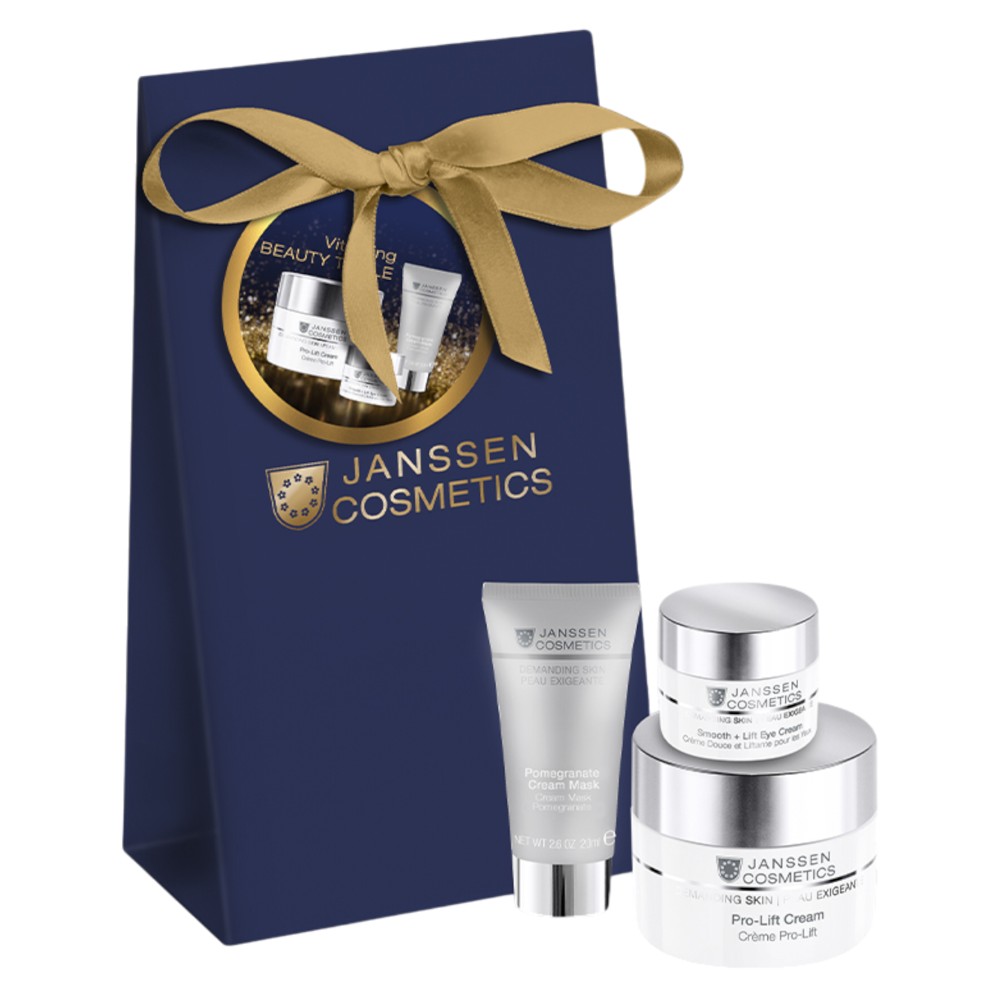 The gift set consists of the new Pro-Lift Cream · 50 ml, the Smooth + Lift Eye Cream · 15 ml, and the wonderfully refreshing and fragrant Pomegranate Cream Mask · 20 ml. The high-quality set is lovingly packaged in a gift bag.