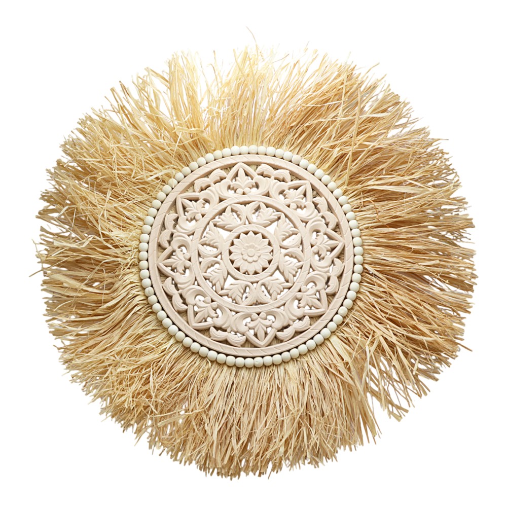 This white and natural straw and wood wall decor measuring 65x65 cm is a unique and warm addition to any space. Masterfully crafted from natural materials, it brings an organic and elegant feel to your decor, combining simplicity with artisanal details. The white and natural colors make this decor suitable for various furnishing styles, from modern to traditional. The dimensions of 65x65 cm make it a strong point of attraction in any room, bringing depth and texture to your walls. This decor is ideal for giving character and warmth to environments such as the living room, bedroom or even work spaces, creating a calm and welcoming atmosphere.