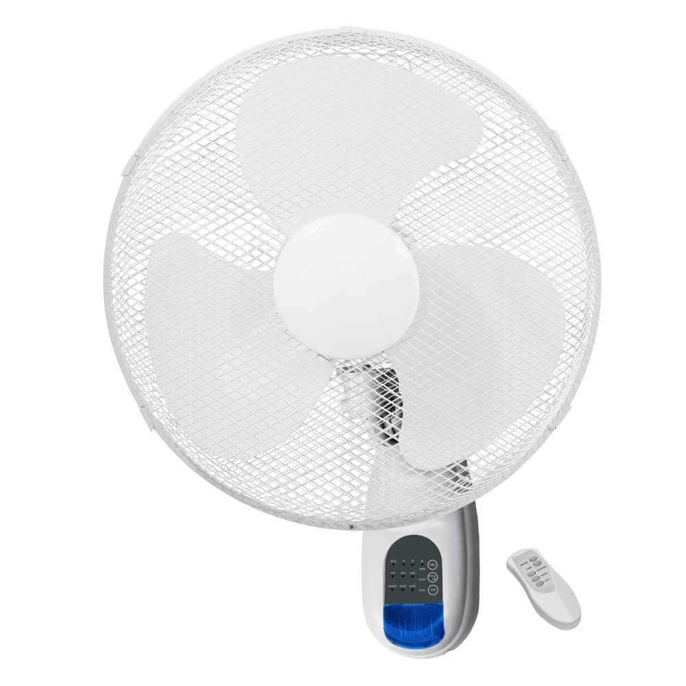 Wall fan Melchioni, with 3 blades Ø40 cm. It has 3 speeds and swing function. With remote control and 7.5 hr timer. Power: 40 W, power supply: 220-240V ~ 50Hz.