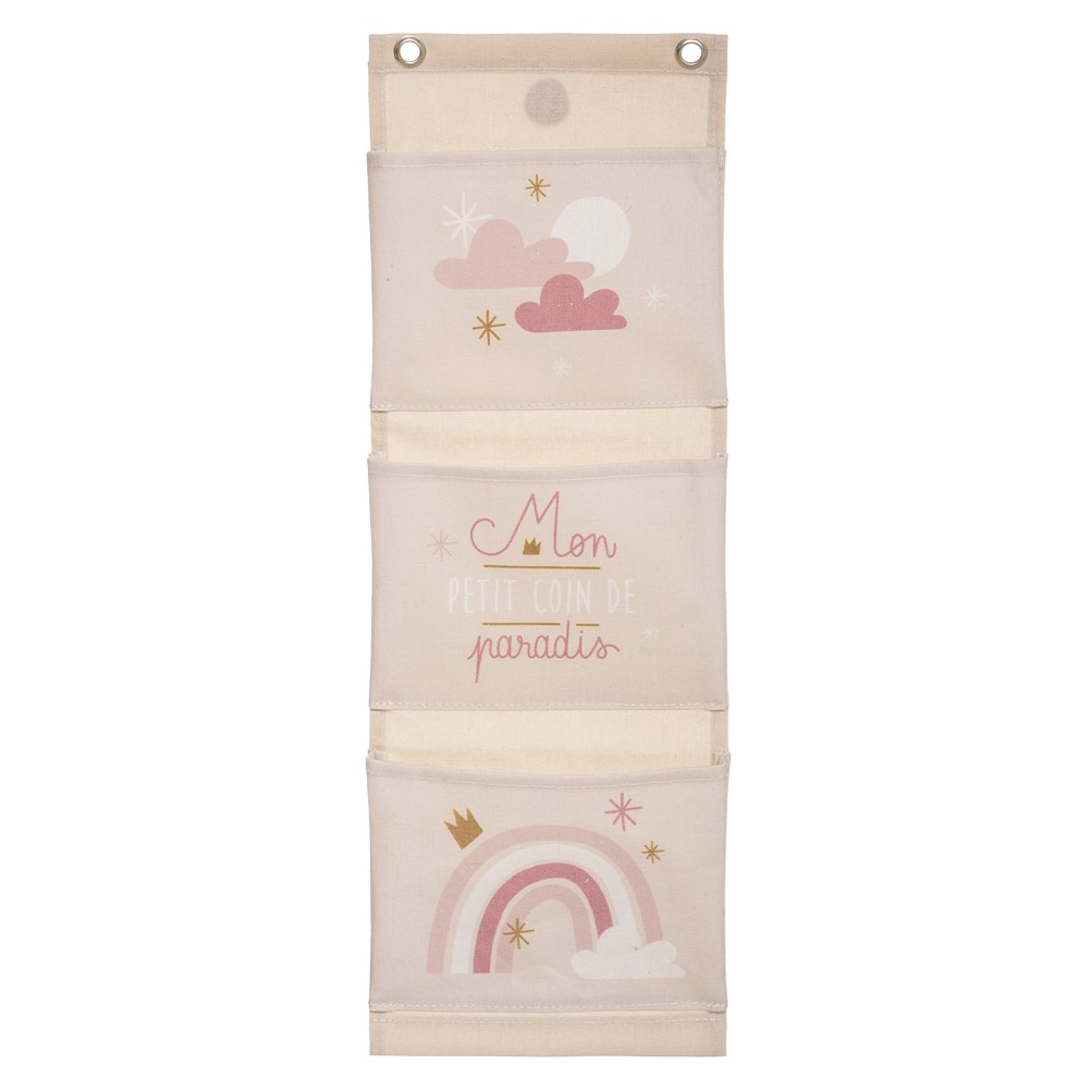 Wall storage with 3 vertical partitions. It consists of textile material. Suitable for hanging on the wall. In it you can put socks, small toys, etc. Light pink color