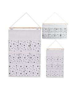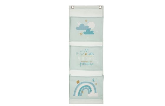 Wall storage with 3 vertical partitions. It consists of textile material. Suitable for hanging on the wall. In it you can put socks, small toys, etc. Light blue color