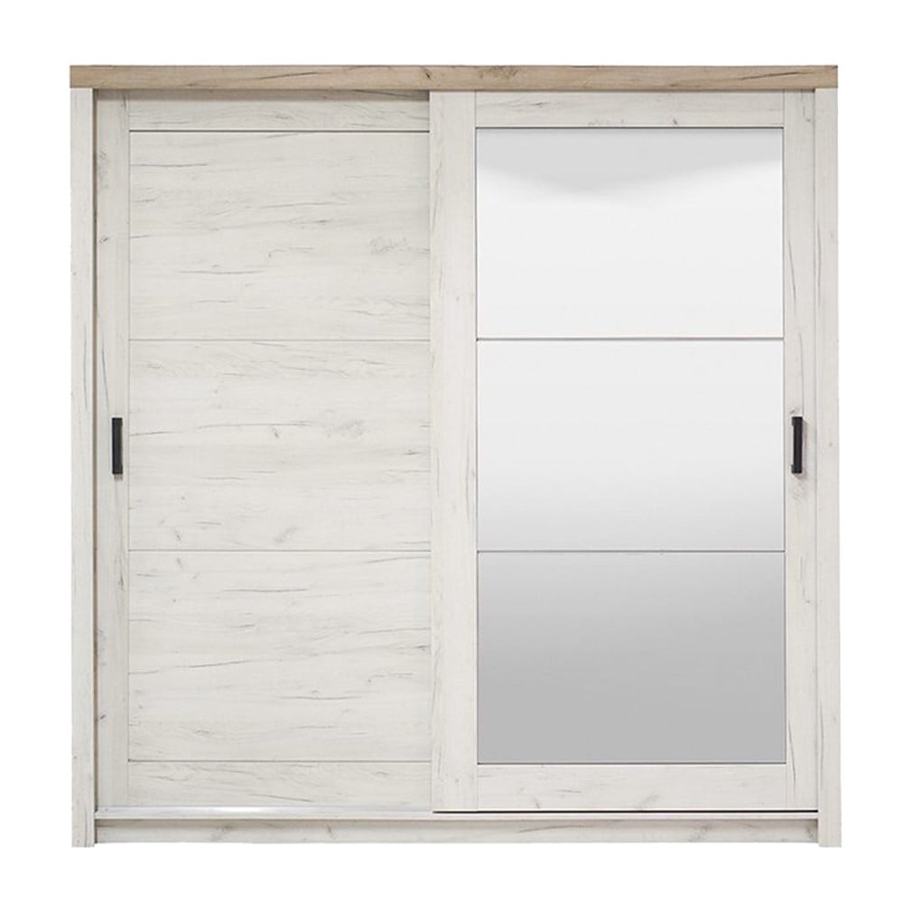 Wardrobe KENT, in white and gray oak décor, has laterally located segments with shelves and centrally located part with the wardrobe rod. A particular benefit of this model is the mirror positioned to the left and the slider mechanism that contributes to the economical organization of the available space. It is a part of the collection bearing the same name that brings a touch of classy classic and refined taste to your home.