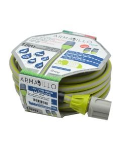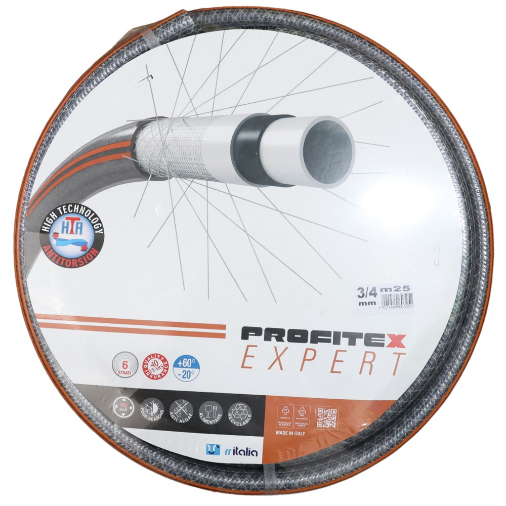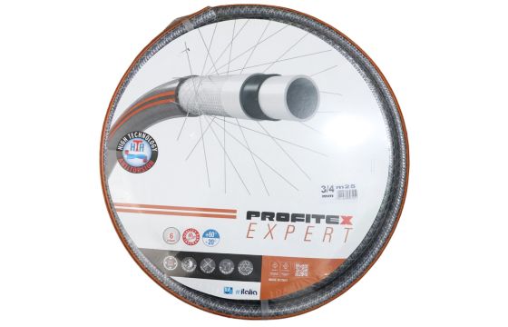 Flexible 6-ply irrigation pipe, 3/4" diameter, spiral braided and anti-twist reinforcement. Excellent flexibility even at very low temperature, against debris (algae) and has a long life. Polyester textile reinforcement braided to withstand 30 bar pressure. Its composition is a new refined rubber formula. Length 25m