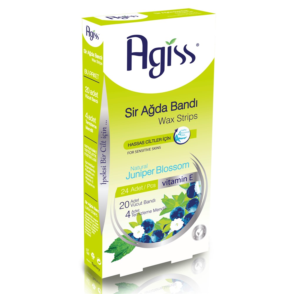 Wax depilation set for body, with juniper blossom extract, which includes 20 body bands and 4 cleansing wipes. This product is suitable for sensitive skin.