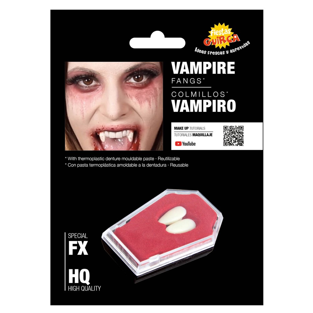 White vampire canines in high quality PVC, with moldable thermoplastic paste, suitable for all teeth. Reusable.