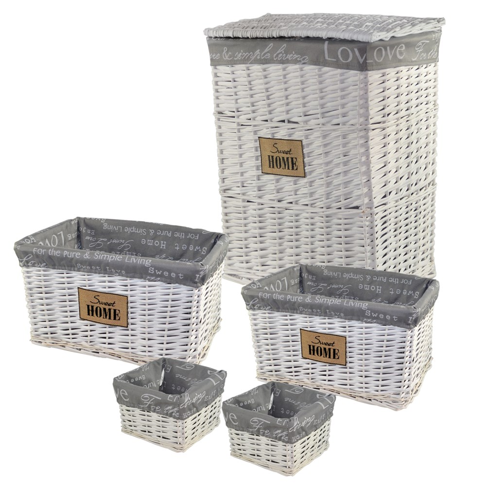 Wicker box set of 5 pieces, willow and textile, grey/white, 45x33xH59 cm; 46x32xH26 cm; 40x26xH24 cm; 22x22xH15 cm