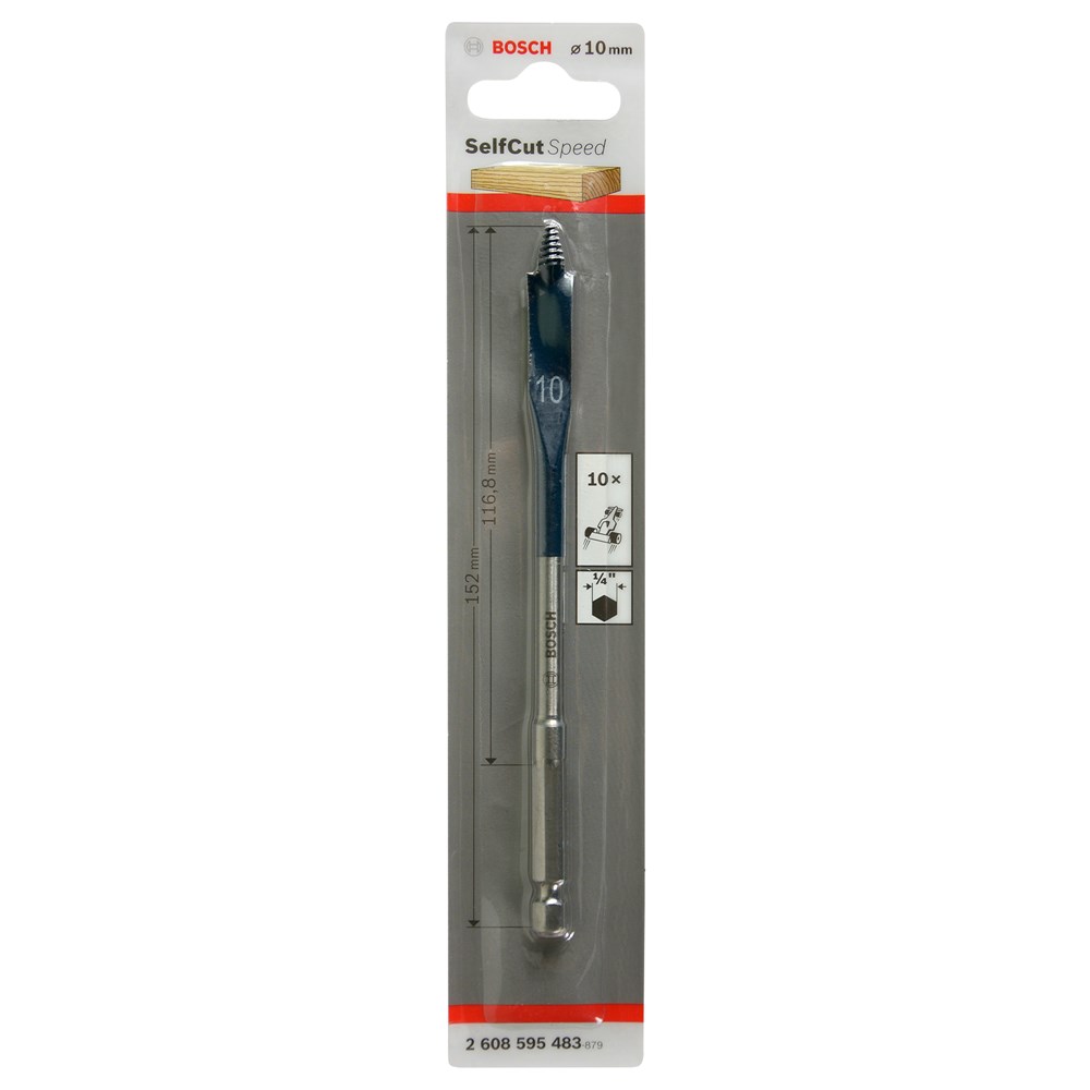 Suitable for soft and hard wood, light building material and plasterboard. Drills three times as fast as standard spade bits. Patent pending, self feeding threaded tip and cutting geometry. Manufactured in accordance with own factory standards from specially toughened steel. Precision ground tip and cutting edges for accurate dimensional stability when drilling. Shank with 1/4" hexagon socket manufactured to DIN 3126 - E 6.3. Innovative self-feeding threaded tip for fast and accurate drilling with little exertion of force