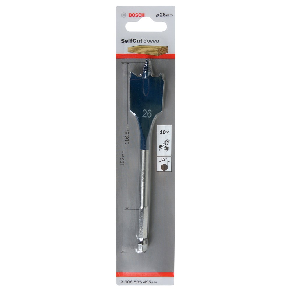 Suitable for soft and hard wood, light building material and plasterboard. Drills three times as fast as standard spade bits. Patent pending, self feeding threaded tip and cutting geometry. Manufactured in accordance with own factory standards from specially toughened steel. Precision ground tip and cutting edges for accurate dimensional stability when drilling. Shank with 1/4" hexagon socket manufactured to DIN 3126 - E 6.3. Innovative self-feeding threaded tip for fast and accurate drilling with little exertion of force