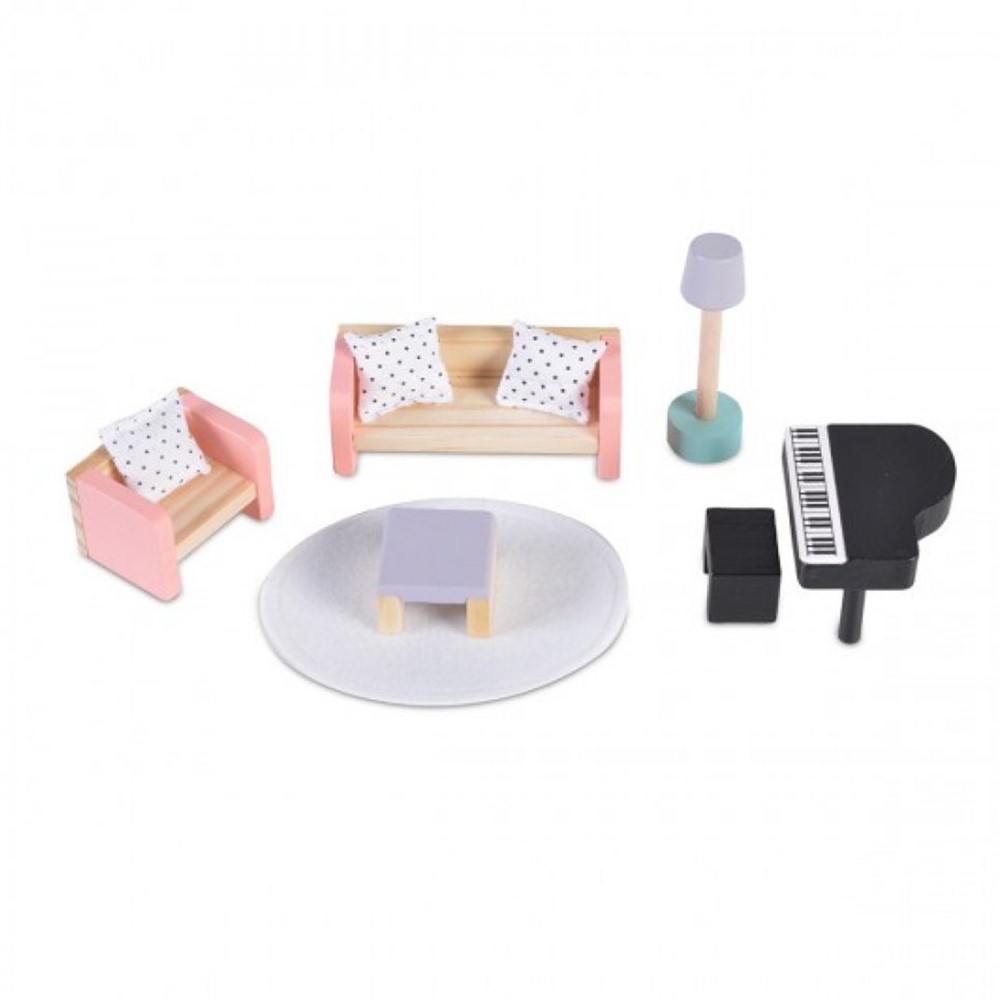 Children's toy set of accessories for the living room in wooden material. The set consists of: 1 sofa, 1 armchair, 1 dresser, 1 table, 1 organ