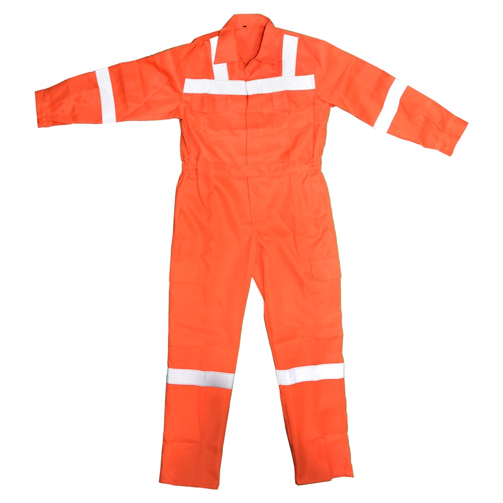 It's a truly functional garment for your basic workwear needs. In 65% cotton&35% polyester twill this durable coverall will provide lasting quality and value. Banded waist with elastic inserts and bi-swing back pleats for ease of movement Front plastik zipper 2 Front zippered chest pockets, 2 back pockets and 2 left pocket Reflective tape on arms and pants provide visibility in adverse weather conditions