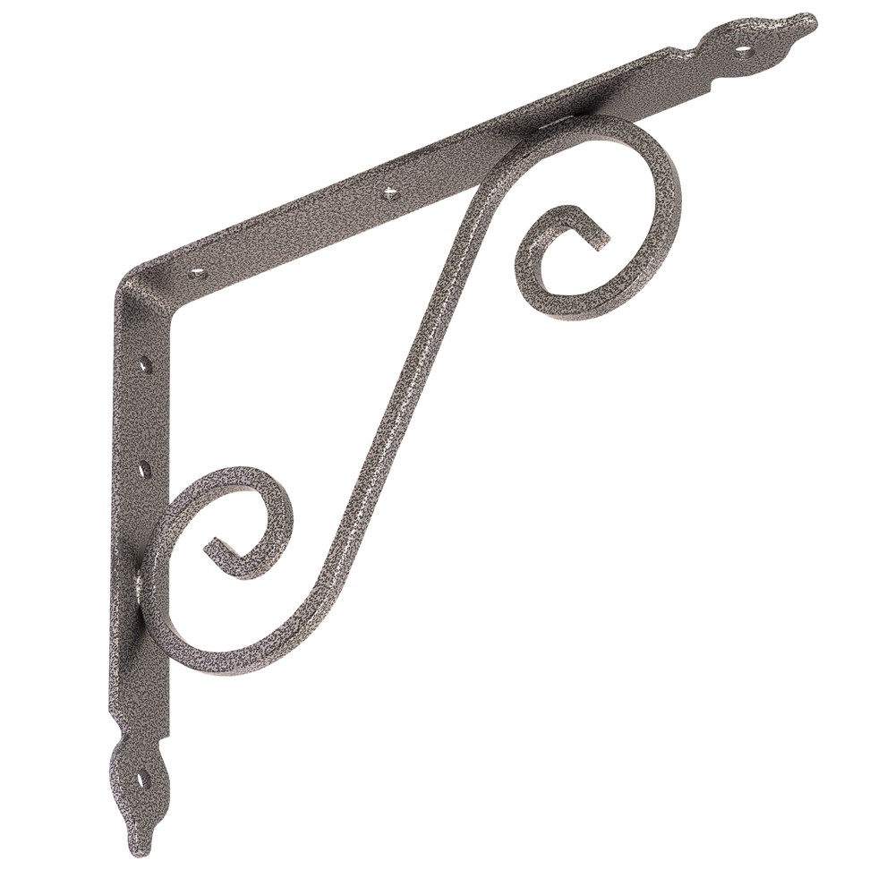Ornamental shelf bracket, made of wrought iron material, in silver color, with dimensions of 24x19 cm, which serves as a decorative and functional accessory for various environments. The constituent material is resistant to use, heavy weights, rust or abrasion. It is used for wall mounting of self-supporting shelves and to enable the installation of LSS (Long Span Storage) type shelves, but it can also find other applications in professional and non-professional environments.