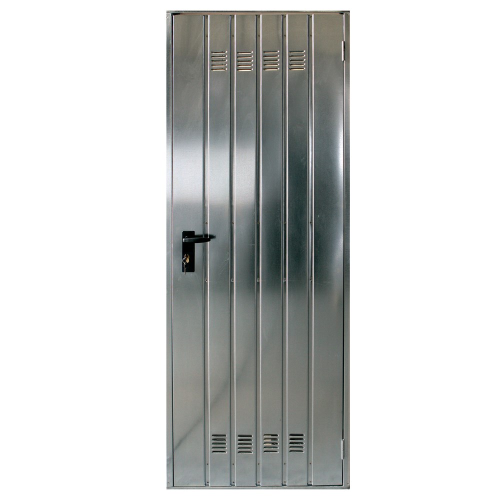 The galvanized metal door has a height of 200 cm and a width of 70 cm. The required light dimensions are 200 cm in height and 70 cm in width. It is made of galvanized steel sheet with a thickness of 0.6 mm, characterized by a corrugated and galvanized finish. The frame is made of galvanized steel with thickness of 1 mm lock cylinder is included in the package and the Italian production.