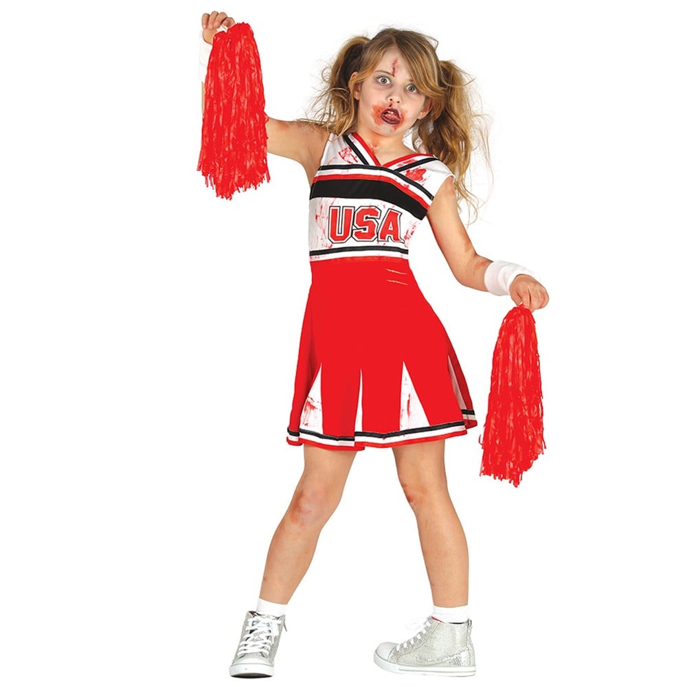 Red and white polyester zombie cheerleader costume. The outfit consists of: dress with the inscription USA. The set does not include the 2 parts of the pom pom.