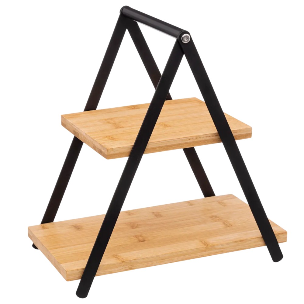 Aksesor për servirje me 3 pozicione shërbimi me dizajn modern. Është bërë nga bambu në një nuancë natyrale me një kornizë metalike të zezë. Mund të përdoret si tabaka për servirje - hors d'oeuvre për dhomën e ngrënies, tavolinën e kafesë ose bufenë.