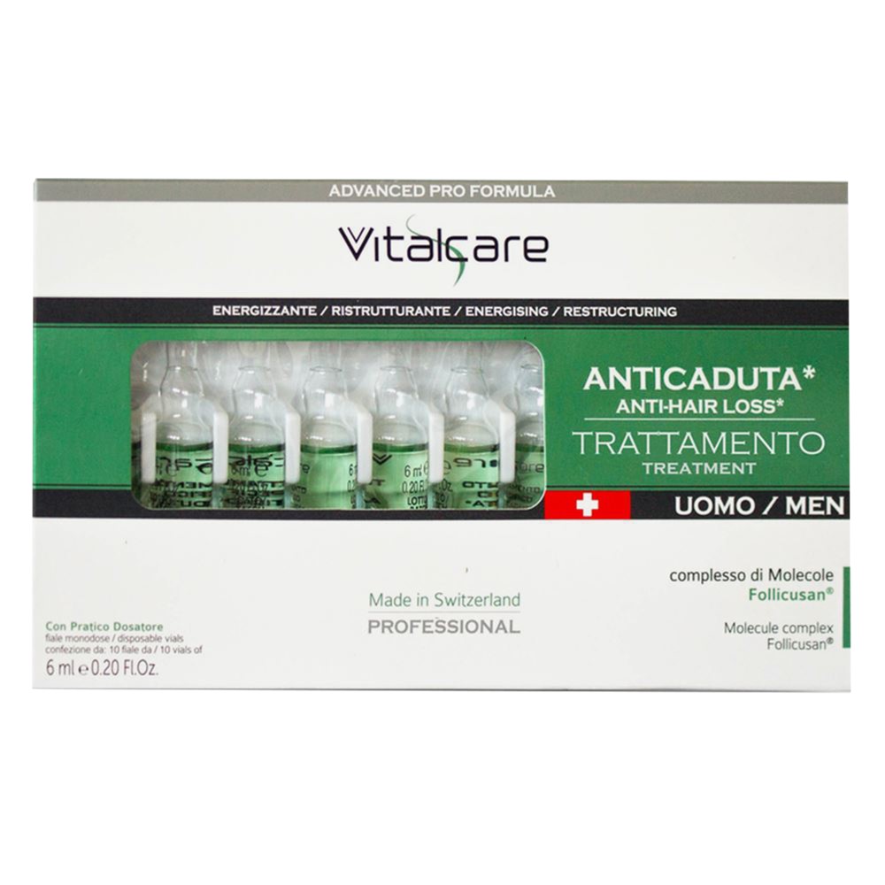 Ampulat kundër rënies së flokëve për meshkuj Vitalcare ndihmojnë në luftimin e rënies së flokëve falë një kompleksi përbërësish aktivë dhe substancave natyrore bimore, veprimi sinergjik i të cilave rikthen kushtet optimale për rritje të fuqishme dhe të shëndetshme të flokëve. Formula e tij inovative bazohet në vetitë rigjallëruese dhe stimuluese të Kompleksit të Molekulave Follicusan, një koncentrat i substancave biologjike dhe proteinave që stimulojnë funksionet e rritjes së flokëve dhe në veprimin stimulues të eukaliptolit në mikroqarkullim.
