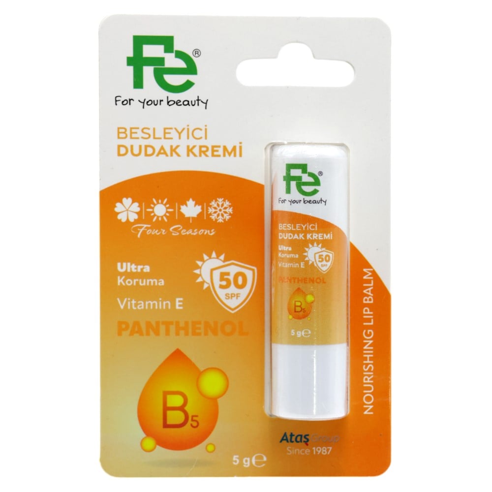 Balsam buzësh Fe, me Panthenol, SPF50, Vitaminë E dhe B5, 5 gr. I krijuar për të ofruar mbrojtje të lartë nga dielli dhe për të ushqyer buzët me hidratim të thellë. Përshtatet për buzë të thara dhe të dëmtuara, duke i mbajtur ato të buta dhe të shëndetshme.