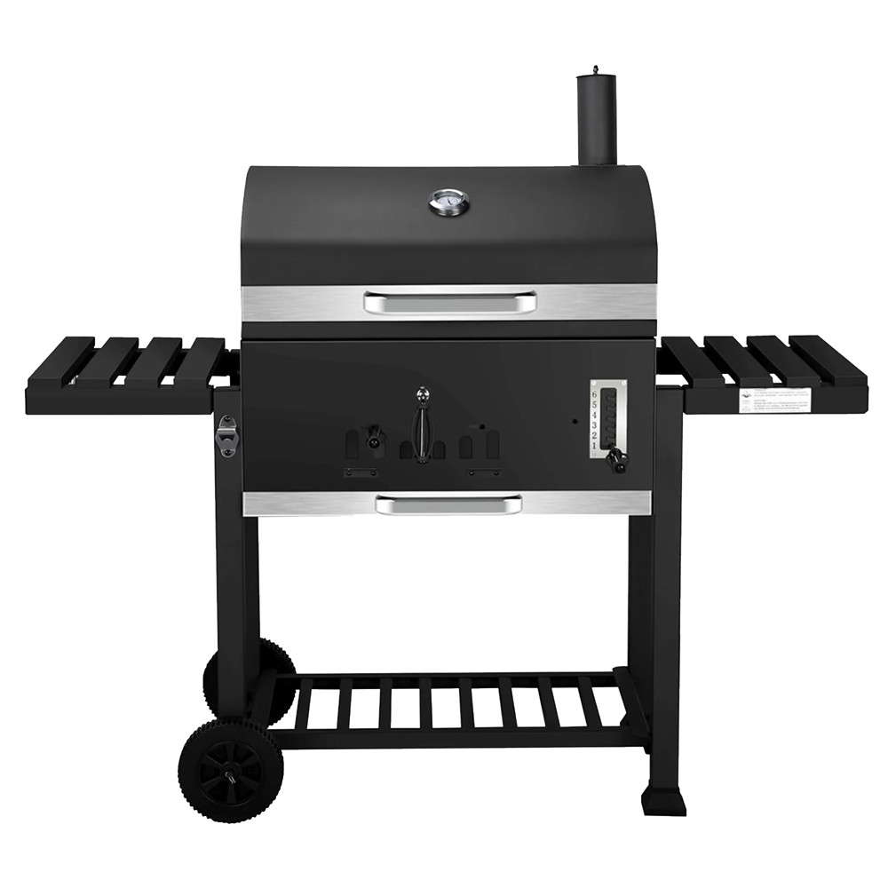 Barbekju me qymyr prej çeliku në dizajnin klasik dhe një gamë të gjerë funksionesh. Kjo barbekju ka një zonë të madhe pjekjeje, kështu që ju mund të gatuani ushqim të mjaftueshëm për të gjithë familjen ose miqtë tuaj. Një mbeshtetese e veçantë parandalon që ushqimi që ende nuk është i nevojshëm, të ftohet pa pasur nevojë të vazhdoni ta gatuani në skarë. Siguria e barbekjus arrihet nga njëra anë nga ndërtimi jashtëzakonisht i qëndrueshëm. Si rezultat, skara nuk bie as në erëra të forta ose në goditje, kështu që qymyri i nxehtë nuk mund të shkaktojë dëme. Nga ana tjetër, skara ka një dhomë zjarri të mbyllur (kapaciteti përafërsisht 2,5 kg qymyr), që do të thotë se qymyri është i mbrojtur mirë nga era ose nga rryma, në mënyrë që të mos hidhen copa ose cifla qymyri. Falë hapësirave të mëdha të mbeshtetjeve dhe hapësit të shisheve, kjo barbecue ofron gjithashtu një gamë të gjerë funksionesh që e bëjnë punën me skarë më të lehtë.