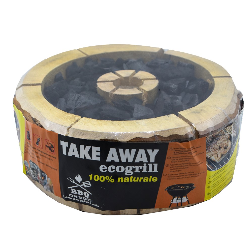 Barbekju me qymyr, me përmasë ø 24 / 28x10h, prej materiali druri I verdhës, e mbushur me qymyr, të një cilësie të lartë, pa kimikate, e mbledhur me dorë dhe e bërë nga plantacionet me një proces rindërtues, kompakt dhe ekologjik. Furnizuar me kub zjarri të bërë nga druri i pishës dhe vajra vegjetale. Koha e djegies së saj është rreth 2 orë (kohëzgjatja ndikohet nga faktorë të jashtëm).
