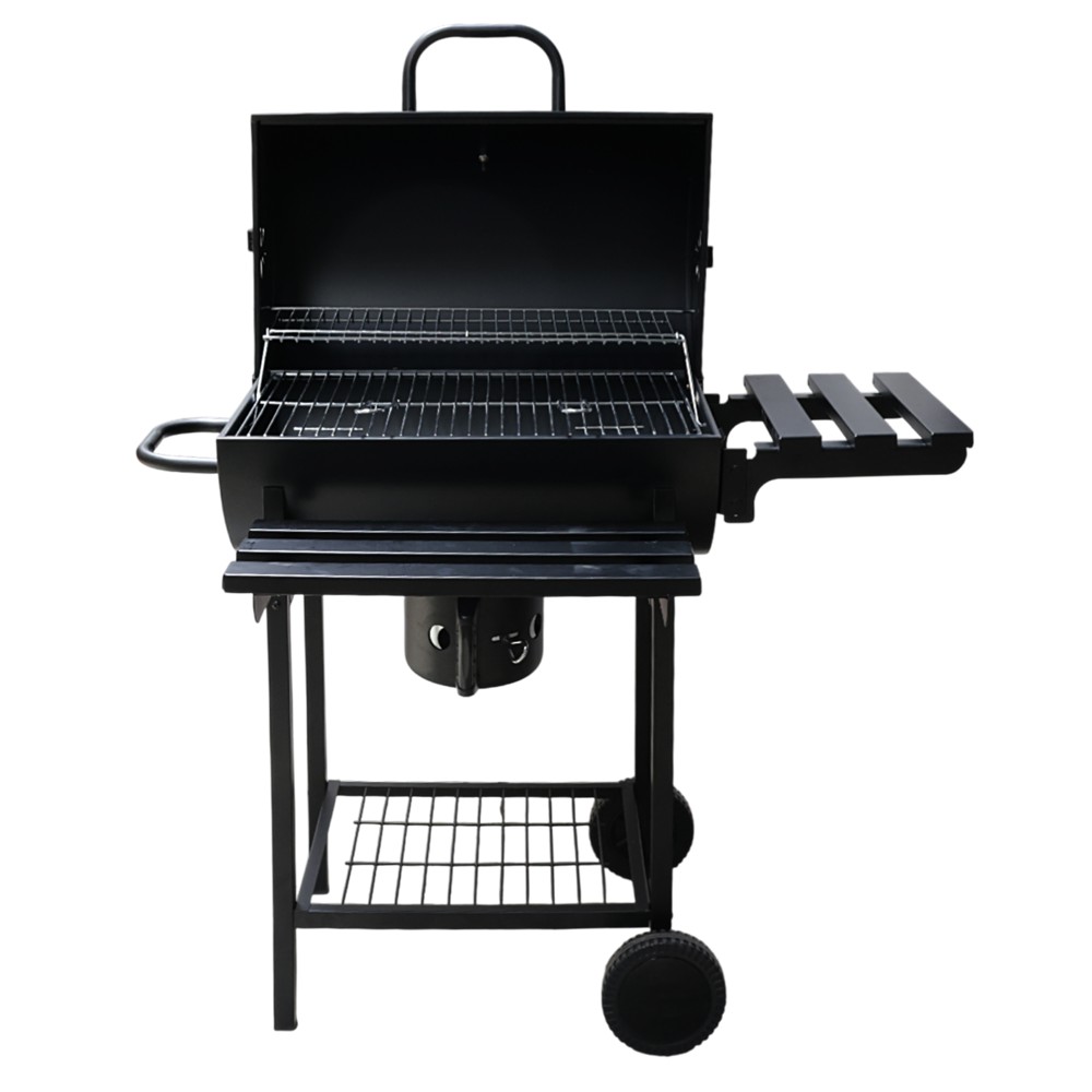 Kjo barbekju me qymyr është zgjedhja ideale për ata që duan të shijojnë pjekje të shijshme dhe të sigurt në kopsht apo oborr. Me një strukturë të fortë metalike dhe përmasa të bollshme, ajo ofron hapësirë të mjaftueshme për të përgatitur ushqime për familjen dhe miqtë pa mundim. Grila e gatimit ka dimensione 55x34 cm dhe është e kromuar, duke siguruar shpërndarje të njëtrajtshme të nxehtësisë dhe pjekje uniforme. Ka një tavolinë anësore dhe një panel frontal prej druri për përgatitje dhe organizim më të lehtë të ushqimeve dhe aksesorëve. Gjithashtu ka një termometër të integruar për kontroll të saktë të temperaturës.