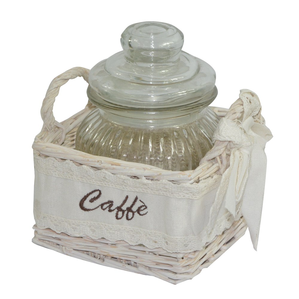 Shporta e kafese me thurje natyrale e cila mban nje kavanoz shume hermetik deri ne 16.5cm lartesi. Me dy doreza me vejshe pambuku dekorative ne pjesen e jashteme e ben kete shporte shume funksionale dhe dekorative per shtepi apo Bar/Restorant.