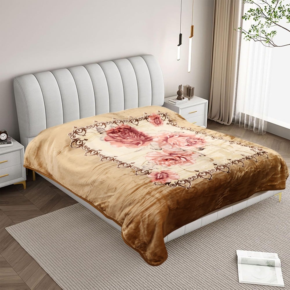 Blanket, Raschel, double, polyester, brown with flowers, 220x240 cm