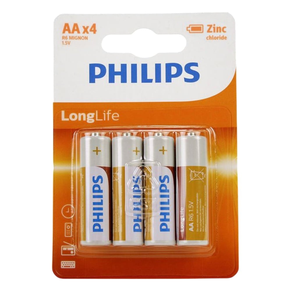 Bateritë Philips R6L4B AA janë të paketuara për 4 copë. Bateritë janë pa metale të rënda të dëmshme si kadmiumi, merkuri dhe plumbi. Bateritë ruajnë të paktën 80% të energjisë së tyre origjinale për pesë vjet.